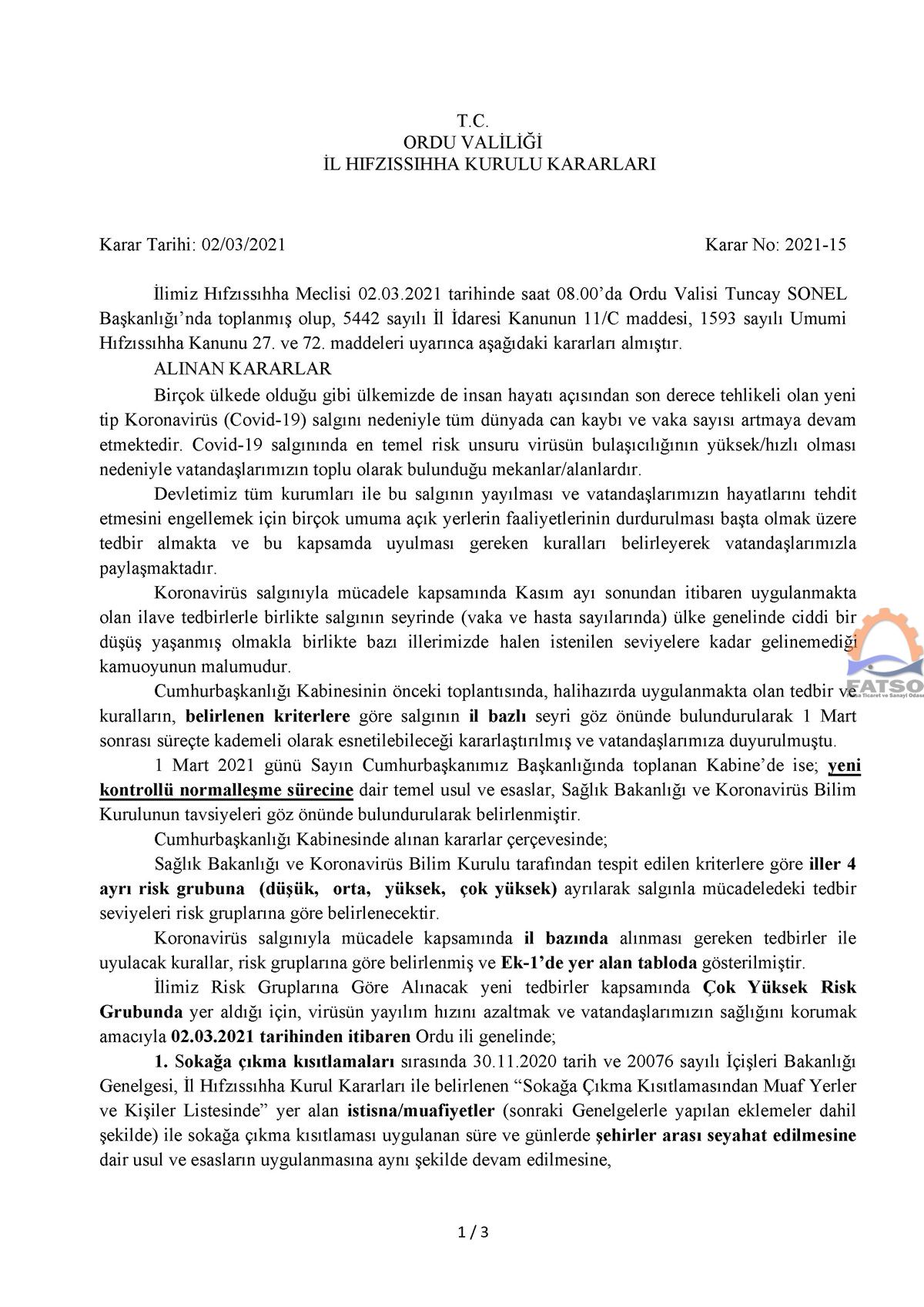 Ordu İl Hıfzıssıhha Kurulu tarafından 'Yeni Kontrollü Normalleşme Süreci'ne ilişkin uygulama esaslarını içeren karar yayımlandı. Kararın detaylarına aşağıda yer alan görseller aracılığıyla ulaşabilirsiniz.
