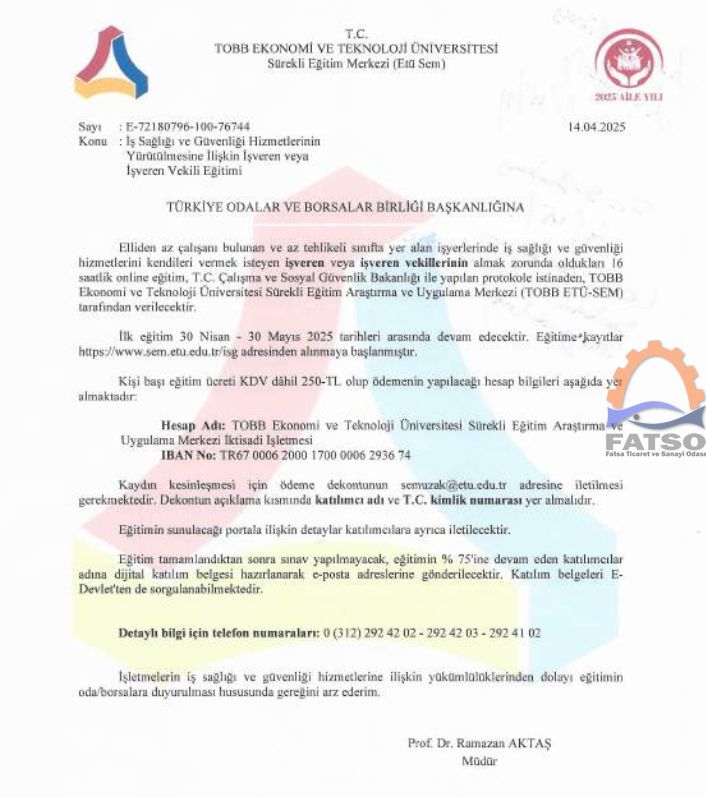 TOBB ETÜ Sürekli Eğitim Araştırma ve Uygulama Merkezi tarafından Birliğimize iletilen ekli yazıda; Çalışma ve Sosyal Güvenlik Bakanlığı ile TOBB Ekonomi ve Teknoloji Üniversitesi arasında yapılan protokol kapsamında, 50'den az çalışanı bulunan ve az tehlikeli sınıfta yer alan işyerlerinde iş sağlığı ve güvenliği hizmetlerini kendileri vermek isteyen işveren ve işveren vekillerinin almak zorunda olduğu eğitimlerin TOBB ETÜ Sürekli Eğitim Araştırma ve Uygulama Merkezi tarafından verileceği bildirilmektedir.