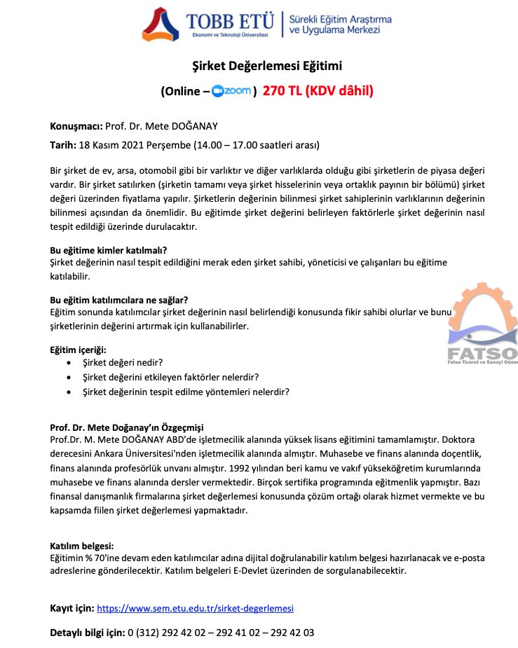 TOBB ETÜ - Sürekli Eğitim Araştırma ve Uygulama Merkezi tarafından internet ortamında online olarak Prof. Dr. Mete DOĞANAY'ın anlatımı ile Şirket Değerlemesi Eğitimi düzenlenecektir.