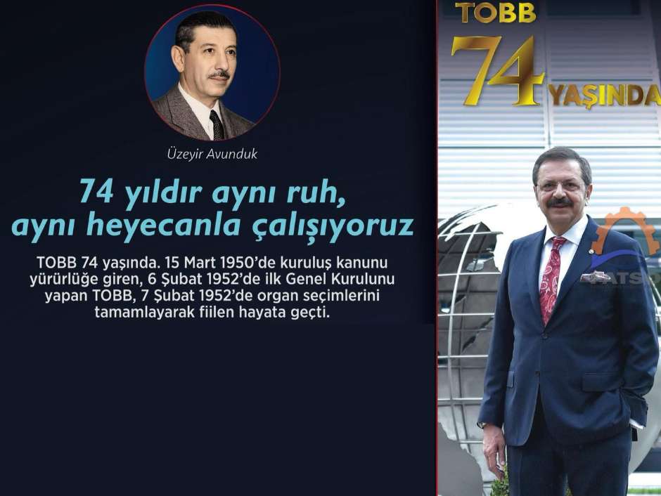 Türkiye Odalar ve Borsalar Birliği (TOBB= 74. kuruluş yılını kutluyor. TOBB Başkanı M. Rifat Hisarcıklıoğlu, “74 yıl sonra aynı ruh, aynı heyecanla, Güçlü Türkiye ve Güçlü Ekonomi için çalışmaya, üyelerimizin sorunlarını takip etmeye, dile getirmeye ve çözüm üretmeye devam ediyoruz” dedi.